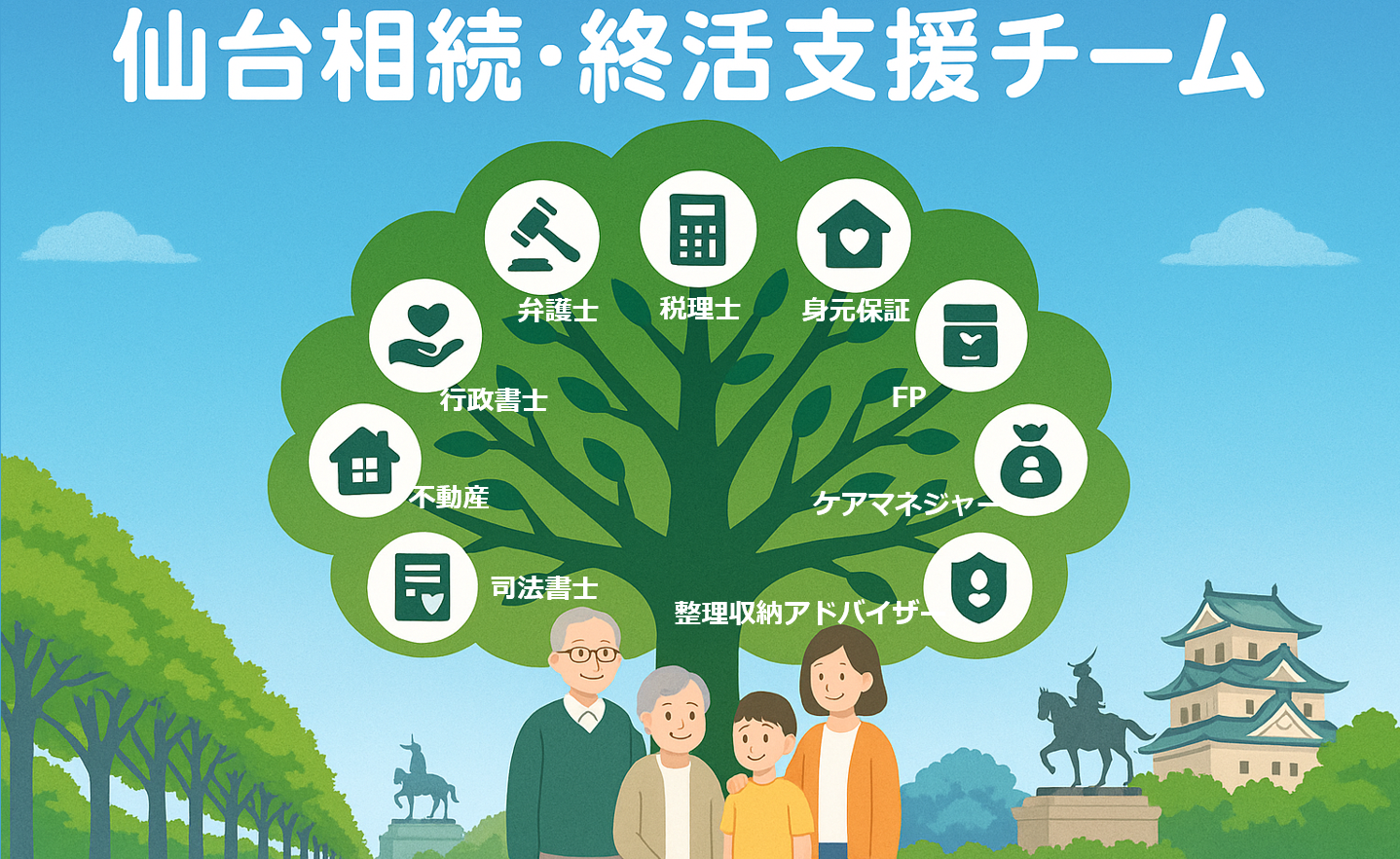 相続を中心に、仙台市をはじめとする宮城県内の専門家が連携し、高齢者とその家族のあらゆる困りごとをワンストップで解決することで、安心して暮らせる地域社会を実現します。